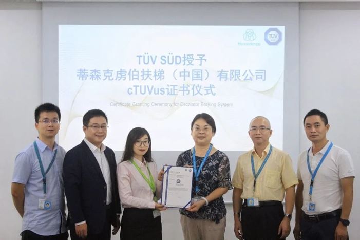 中國/中山 近日,TÜV南德意志集團(以下簡稱“TÜV南德”)與蒂森克虜伯扶梯(中國)有限公司(以下簡稱“蒂森扶梯”)于廣東省中山市舉行頒證儀式,由TÜV南德為蒂森扶梯頒發扶梯制動系統cTUVus證書。蒂森扶梯海外銷售經理李輝先生、質量部經理吳旭輝先生、項目負責人陳衛紅女士等及TÜV南德建筑與基礎設施部經理王鵬先生、建筑與基礎設施部主管李雪婉女士共同出席了此次頒證儀式,雙方對此項目發表了致辭。該證書的頒發,標志著蒂森扶梯研發的Velino (Commercial),Tugela 和Victoria (Public)等扶梯制動系統已獲得進入北美和加拿大市場許可,為集團進一步深耕扶梯商業產品制造,開拓國際市場奠定了里程碑。