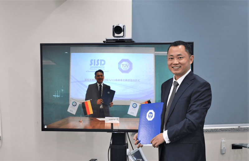 TÜV南德北亞區首席財務官李仲衡先生與深圳可持續發展研究院院長張亞龍先生視頻簽署合作備忘錄