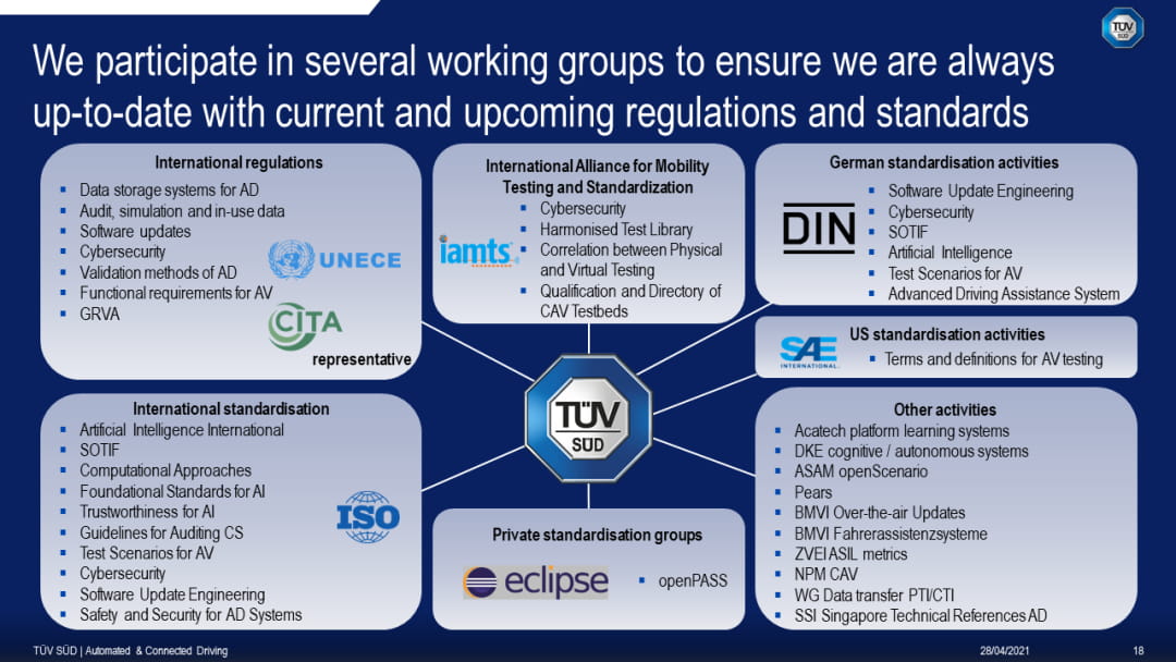 目前,TÜV南德已獲批成為德國交通部(以下簡稱“KBA”)指定的聯合國法規UN-R155、UN-R156和UN-R157的技術服務機構之一,可根據這3項法規的要求提供KBA指定范圍內的型式認證服務,幫助企業跨越在實施有關網絡安全、車輛軟件更新和ALKS等最新UNECE法規時所面臨的技術壁壘,攜手助推自動駕駛技術安全應用。