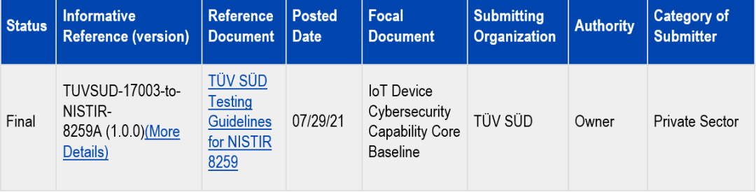 近日,TÜV南德意志集團針對美國NISTIR 8259A《物聯網設備網絡安全能力核心基線》開發的測試標準程序文件TÜV SÜD-17003-to-NISTIR-8259A (1.0.0),通過了美國國家標準技術研究院(簡稱“NIST”)的檢查分析,被列入美國國家在線信息參考目錄(簡稱“OLIR”)。