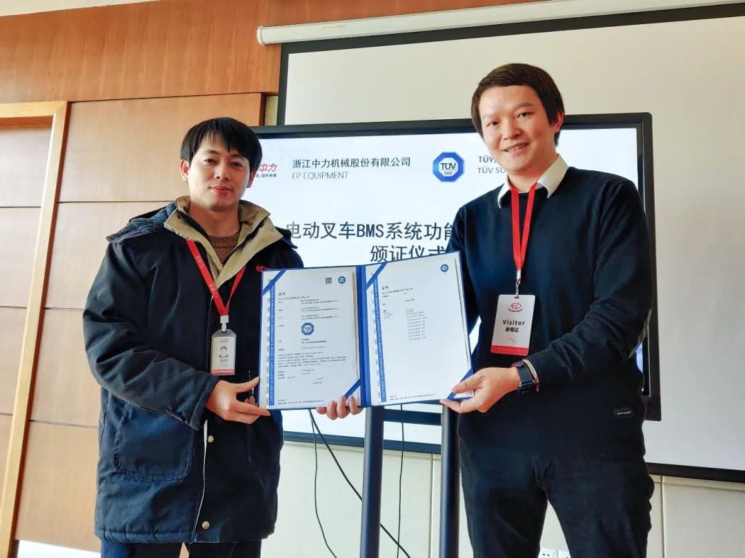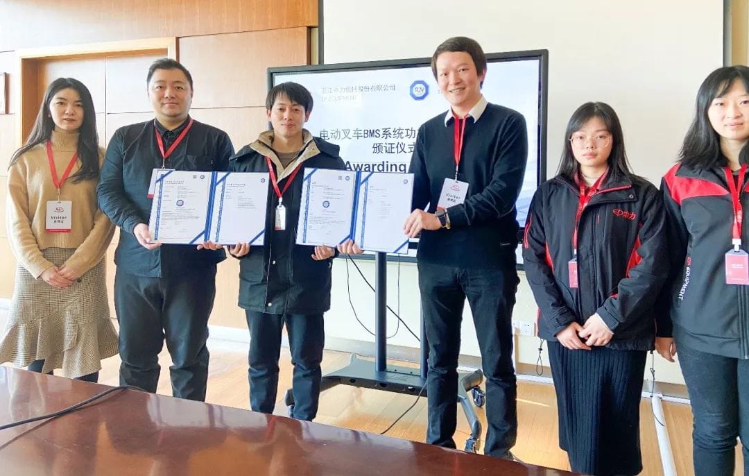 中國/湖州 2021年1月20日,TÜV南德意志大中華集團(以下簡稱“TÜV南德”)為浙江中力機械股份有限公司(以下簡稱“中力”)頒發了TÜV南德中國功能安全證書。此次通過認證的產品是中力用于工業卡車鋰電池的電池管理系統(Battery Management System,以下簡稱“BMS系統”)、型號為ELI130_48CE的電池管理系統。雙方在湖州舉行了頒證儀式,浙江中力測試中心副主任王勝乾先生、市場運營經理鄔紅梅女士,TÜV南德工業產品部華中區銷售經理唐佳輝先生、高級銷售專員周賢先生等出席了儀式。