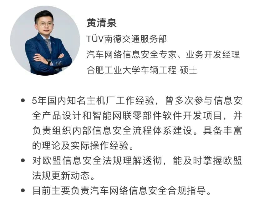 日前,歐盟汽車專家組提交了Regulation (EU) 2019/2144關于引入UN-R156軟件更新法規(以下簡稱“UN-R156”)內容的修訂法規討論稿,這使得這一法規在歐盟地區的實施時間和型式審批方式逐步趨向明朗化。TÜV南德意志集團(以下簡稱“TÜV南德”)密切關注國際車輛法規動態,汽車網絡信息安全專家黃清泉特針對此討論稿為有計劃出口至這一地區的國內汽車企業進行梳理與解析。