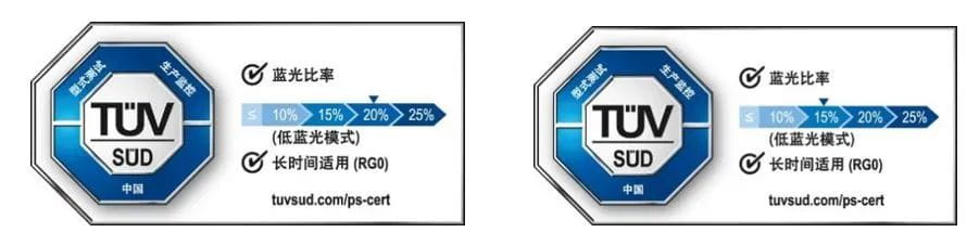 該測試結果不僅表明產品在正常顯示模式下進行光生物等級評估時,能達到豁免等級(RG0),即依據國際相關標準的定義,長時間使用時所可能帶來的視網膜傷害風險較小;還表明在低藍光顯示模式下,其所釋放的藍光輻射能量占可見光總光譜輻射能量的比率分別不高于20%和15%,低于太陽光當中藍光和可見光的比率25%。TÜV南德China Mark中國認證標志用數據證明產品除滿足基本的市場準入要求外,還滿足額外的定制化補充測試要求,使產品在競爭對手中脫穎而出,增強消費者體驗感和產品核心競爭力。