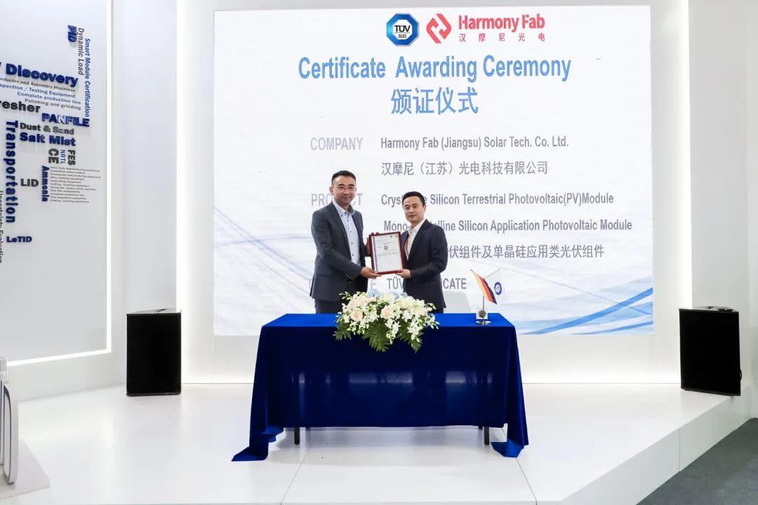 TÜV南德授予漢摩尼高效疊瓦應用類光伏組件TÜV南德認證證書