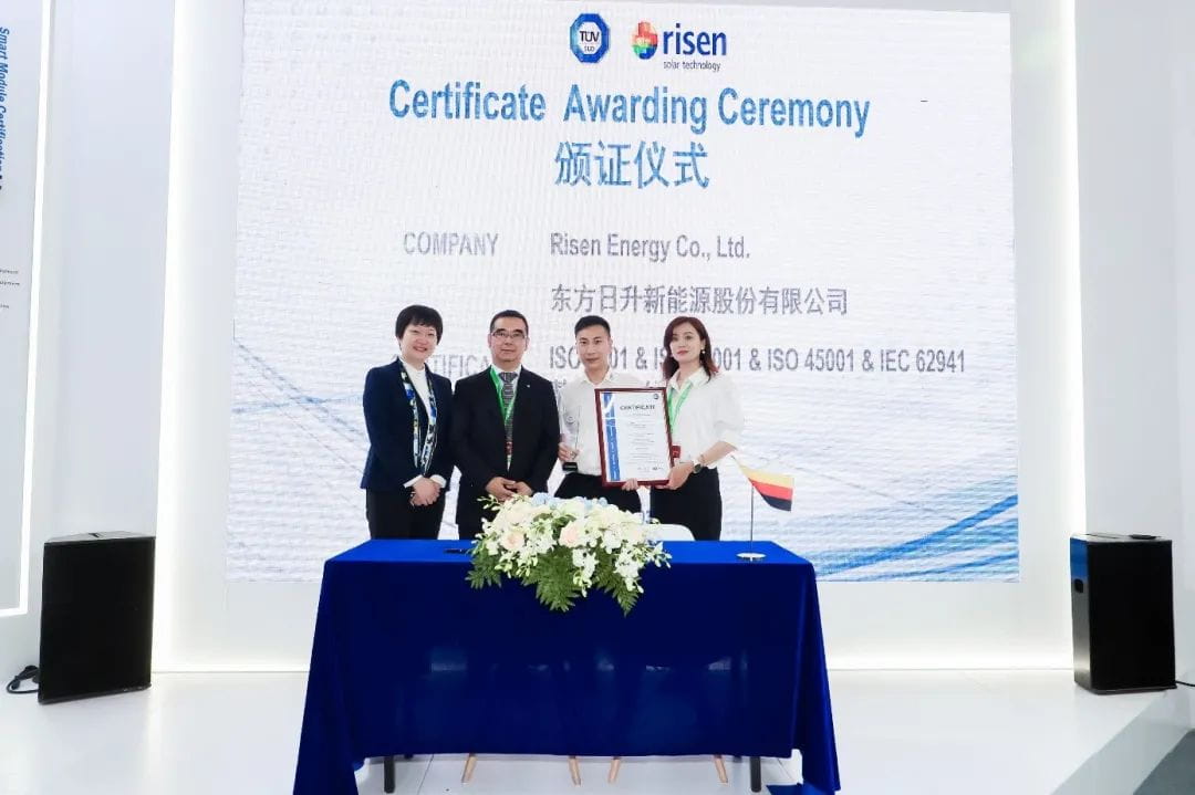 中國/上海 6月3日,TÜV南德意志大中華集團(以下簡稱“TÜV南德”)于在第十五屆(2021)國際太陽能光伏與智慧能源(上海)展覽會暨論壇(以下簡稱“SNEC”)期間為東方日升新能源股份有限公司(以下簡稱“東方日升”)頒發ISO 9001:2015、ISO 14001:2015、ISO 45001:2018 及IEC 62941:2019質量、環境、職業健康安全、光伏組件制造質量體系證書,并同時頒發了“攜手共進、追求卓越”杰出合作伙伴獎。TÜV南德管理服務部總監汪微波先生,東方日升管理層出席了此次頒證儀式。