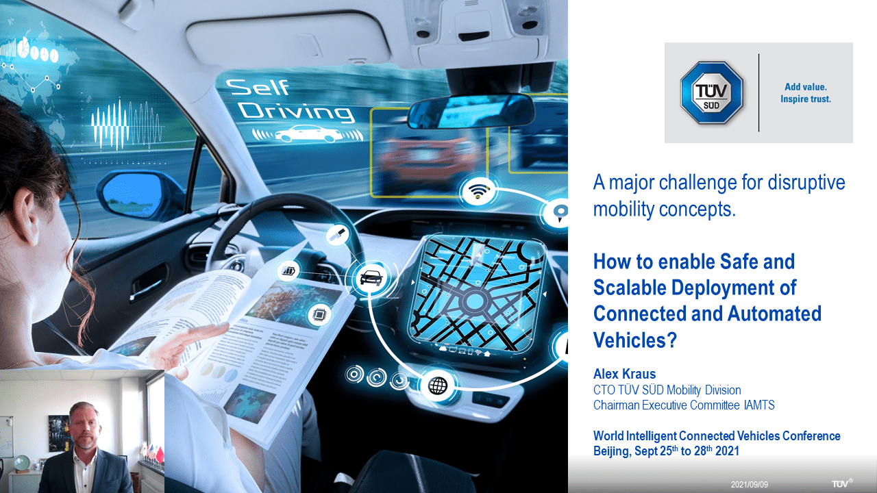 中國/北京 9月27日, 第三方檢測認證機構TÜV 南德意志集團(以下簡稱“TÜV南德”)受邀出席2021世界智能網聯汽車大會。TÜV南德全球交通服務部首席技術官、國際智能網聯汽車合作聯盟(以下簡稱“IAMTS”)聯合創始人及執行主席Alexander Kraus于未來出行與智慧物流主題峰會做主旨演講,分享了TÜV南德在確保智能網聯汽車安全可控發展領域所作的探索與取得的實踐成果。本屆大會以“引新薈智、綠創未來”為主題,圍繞產業再造、融合應用、和合共生三個篇章展開,把脈產業升級新發展機遇,貫徹安全引領創新發展理念,推動構建智能網聯汽車產業合作共贏的新發展格局。