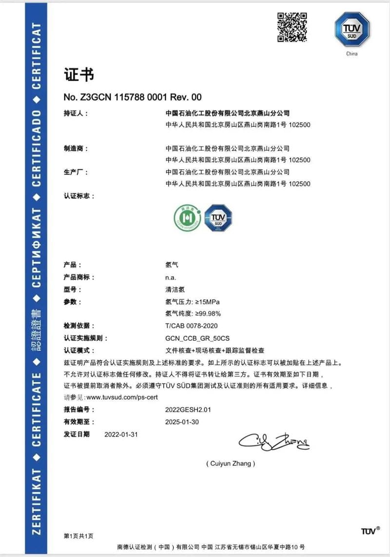 TÜV南德發布全國首張清潔氫證書